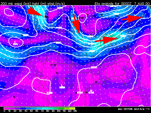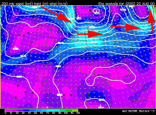 Here is the jet stream mid day on Aug 22, 2000 just before Hurricane Alberto goes north of it. It is going very fast (green) and bending up ward until it goes into the arctic. It even reversese itself and goes a bit to the west. This has to be affecting the weather in Europe which won't even see the hurricane itself for another four or five days.