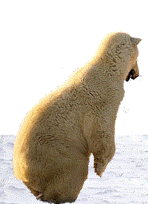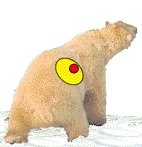 ...is putting his paws down on the ground right before he starts to run (just about NOW plus or minus 1/4 second) your spear hits him in the vital area. If you hit him anywhere in the indicated yellow or red areas then the spear goes under his ribs, into the chest cavity and you have just killed your first polar bear. If your spear hits the center red area it's the heart and that kills him almost instantly. Hit him anywhere in the yellow area and you have penetrated the lungs and that shortens his remaining lifespan down to less than ten minutes. As he runs, the lower back muscles, where the spear enters his body will cause the blade of the spear to sweep back and forth across the inside of his chest. Ideally you want to throw the spear with the blade slightly CCW of vertical so that it cuts with the grain of the bears back muscle and when he comes down on all fours the blade is situated in the vertical position. Then when the blade sweeps sideways as he runs it macerates his heart and lungs in one or two steps so he falls down dead in three to four steps. Hit him anywhere else on his body and it is not immediately fatal. The spear falls out as he runs. The spear hurts but he only thinks that you have reached out and clawed him as he was running away. That happens to Polar Bears a lot so it's nothing new to the one you are hunting. It just confirms that you are the most dominant and most determined polar bear around. Now you have to move up and take over the territory that he thinks you have just chased him out of. I am assuming that spear fell out so pick it up. Don't feel you have in any way failed.
