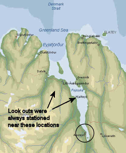 An excellent example is Akureyri which is a very old and the third largest city in Iceland. Even though it took a day and a half sailing to even get to the ocean (and impossible with a fair north wind) it was still favored as a port since it was in a very safe location. Lookouts were hidden in the two places indicated on the map where they could see any ships from far away. (I never went up on that mountain so I would not know where the ruins of the lookout station are.) The protrusion of land at Hjalteyri blocked the view of Akureyri from further out. By the time marauders ever got as far as Hjalteyri we would have hidden the settlement. The Viking ships were always kept up the river where they could not be seen from Hjalteyri. Half way between Hjalteyri and Akureyri looks like a much better place for a settlement doesn't it? That is why we did not use it and left it as a ruse. It was left pristine and unoccupied. Marauders would go as far as that area and they could see to Akureyri and tell it looked too forbidding to be populated and then just turn and leave. They thought that if anyone lived in that fjord they would not live that far from the ocean. Since they found no evidence of people farther out they would assume that the rest of the fjord was unoccupied. They would usually just turn around and leave. The fact that they came in sailing ships that could not sail into the wind and could not be rowed made them fear they would get caught in a north wind and not be able to get out of the fjord only added to their resolve to turn around and leave as soon as possible. The city of Akureyri is in a very poor location with almost no flat land. Anybody who builds there almost has to make their own land and most of the land there has been made by dredging.