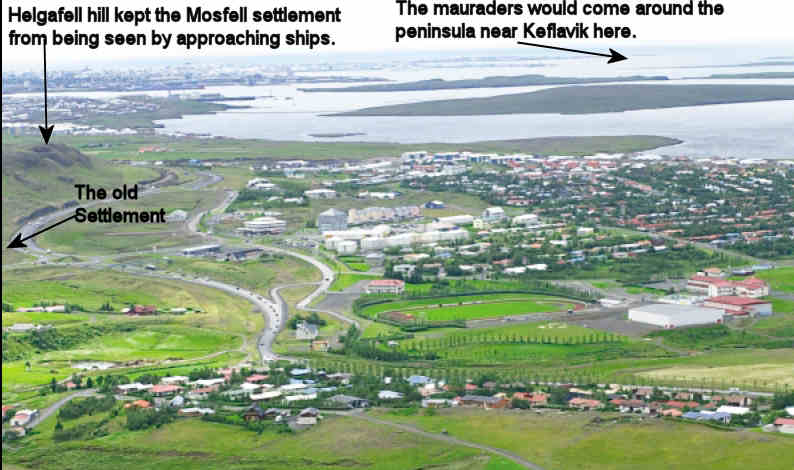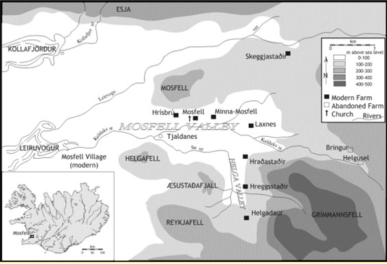 Anyone who looks at this map of the eleventh century Mosfell settlement, near the capital of Iceland, Reykjavik, can see how the town was once hidden. First notice that the buildings were not located very near the ocean but back in the valley where they could not be seen by any approaching ships.