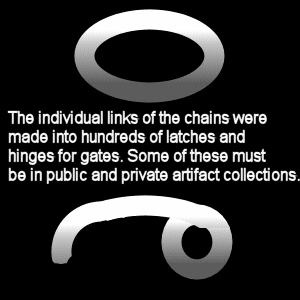 Behind those two communities there is a ridge located about fifteen Km away. From it you can see approaching ships from the South East. A thousand years ago when most of the invading marauders came from England (which includes Wales, Ireland, Scotland and most of the rest of the world) we used to say that from the ridge 'you could see half way to England'. There were observers on that ridge 24/7 and they had trained dogs that would to take messages to Reykjavik in less than an hour. It would still take invaders at least one whole day to round the point at Keflavik about 50 Km to the west and south. Then it took another half day before they could get to the settlements. (The foundations of the two buildings near the top of the ridge may be intact and that would make a good archeology project for some University student.) By the time any ship reached the settlements not only would it be hidden but a lot of the men who were farmers from inland would have arrived to help the women at the settlements. That group would be hidden nearby armed and waiting behind hills in case the marauders discovered Mosfell. Then later, about the 1100's the Moslem slavers came with dogs that could find anyone who was hiding. Two villages disappeared before we caught on to them. Then they started coming in force. They must have tortured those that they took and found out where most of the Iceland population was since they headed straight to the Reykjavik area. From then on we had to leave the Reykjavik area when invaders came. The population would sail to the fjords to the north along the coast and be hidden long before the slavers would even round the point near Keflavik. When the slavers landed they would find nothing but abandoned villages so they would go looking for the Reykjavik Icelanders. Of course they would check the fjords. Icelanders by this time would be arriving from all over the island. We would take the offensive and have a couple of fast rowers lead them into the narrowest fjord with the steepest walls. By then half of the island farmers would have arrived from inland and from high up we would all cause huge avalanches of rocks, throw large boulders, burning branches of trees and flaming pots of whale oil on to their ships. The rocks would go right through the ships and make them sink but probably the best was the burning whale oil with lots of finger length strips of whale blubber. The blubber would stick like napalm to the marauders but it would burn a long time. [The strips of blubber firghtened them so much that one little burning piece made them run around their ship screaming like they were crazy. I did not realize it until just now but I'm certain they thought that they were strips of pork. No wonder they were so effective since contact with one piece would keep those Moslems from getting into paradise! It's amazing how a little knowlege about a religion changes a persons perspective about an event...even 800 years later.] The ships were dragged up by our men and all the metal was removed. Even the chains that they were going to use on us were reworked into tools and I distinctly recall that many of the links were reworked like this: